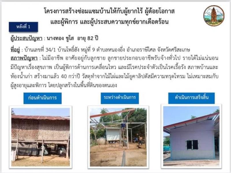 description นายสำรวย เกษกุล ผู้ว่าราชการจังหวัดศรีสะเกษ เป็นประธานมอบบ้านตามโครงการสร้าง/ซ่อมแซมบ้านให้แก่ผู้ยากไร้ ผู้ด้อยโอกาส ผู้พิการ และผู้ประสบความทุกข์ยากเดือดร้อน เฉลิมพระเกียรติสมเด็จพระกนิษฐาธิราชเจ้า กรมสมเด็จพระเทพรัตนราชสุดาฯ สยามบรมราชกุมารี อุปนายิกาผู้อำนวยการสภากาชาดไทย เนื่องในวันคล้ายวันพระราชสมภพทรงเจริญพระชนมายุ 68 พรรษา 2 เมษายน 2566 ราย นางทอง ชูโส บ้านเลขที่ 34/1 หมู่ที่ 9 บ้านโพธิ์ฮัง ตำบลหนองอึ่ง อำเภอราษีไศล จังหวัดศรีสะเกษได้รับเงินสนับสนุนการสร้างบ้านจากจังหวัดศรีสะเกษ จำนวน 50,000 บาท และการสนับสนุนเพิ่มเติมจากส่วนราชการ องค์กรปกครองส่วนท้องถิ่น ภาคเอกชนโดยมีนายอนุชา เรืองอมรวิวัฒน์ นายอำเภอราษีไศล พร้อมด้วยปลัดอำเภอ หัวหน้าส่วนราชการ หัวหน้าหน่วยงานรัฐวิสาหกิจ องค์การบริหารส่วนตำบลหนองอึ่ง กำนันตำบลหนองอี่ง ผู้ใหญ่บ้านในพื้นที่ตำบลหนองอึ่ง และประชาชนในพื้นที่เข้าร่วมต้อนรับโดยหน่วยงานต่างๆ ได้มอบสิ่งของ เครื่องอุปโภคบริโภค และเครื่องใช้จำเป็นให้แก่ครอบครัวของราษฎรรายดังกล่าวเพื่อใช้ในการดำรงชีพต่อไปองค์การบริหารส่วนตำบลหนองอึ่ง ขอขอบพระคุณหน่วยงานทุกภาคส่วนเป็นอย่างสูง ในการช่วยเหลือซ่อมแซม/สร้างบ้านให้กับผู้ประสบปัญหาทางสังคมในครั้งนี้ person admin
