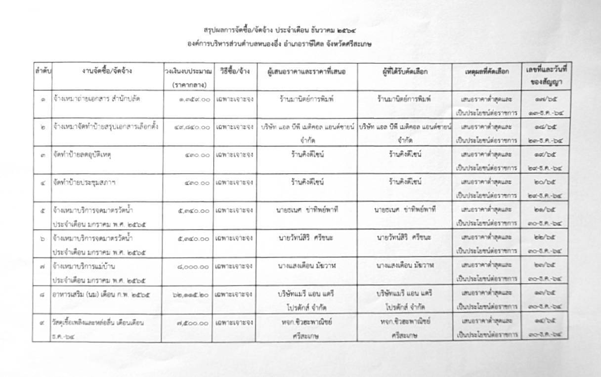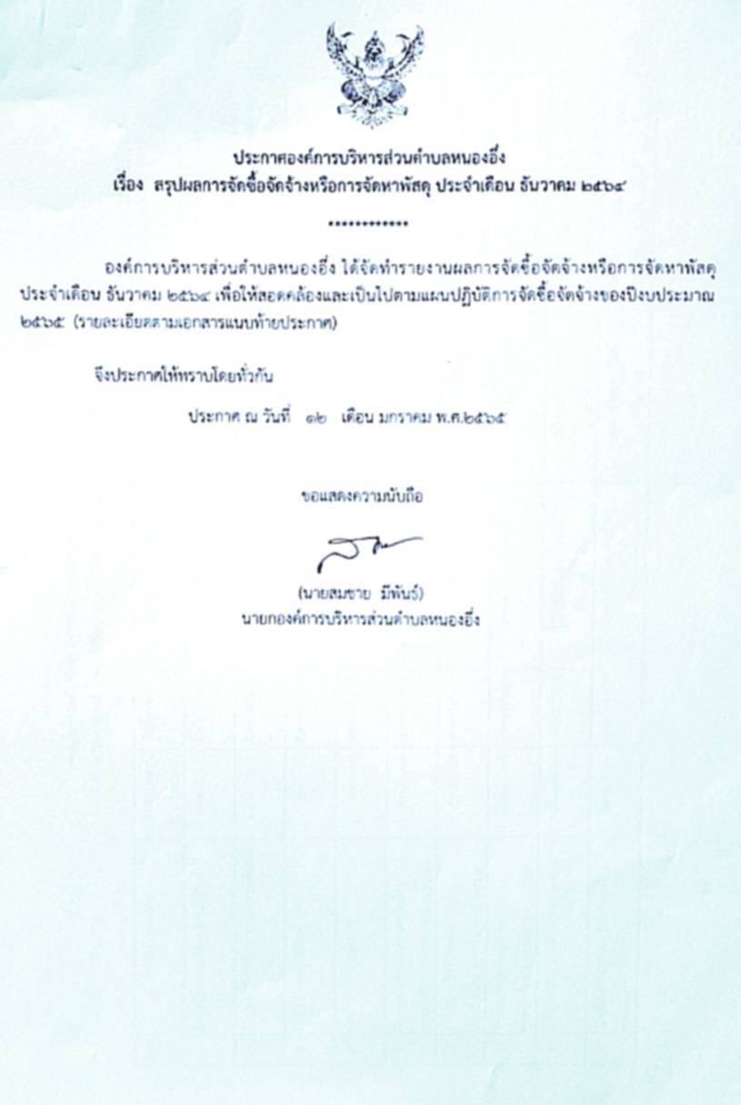สรุปผลการดำเนินการจัดซื้อจัดจ้างในรอบเดือน ธันวาคม 2564