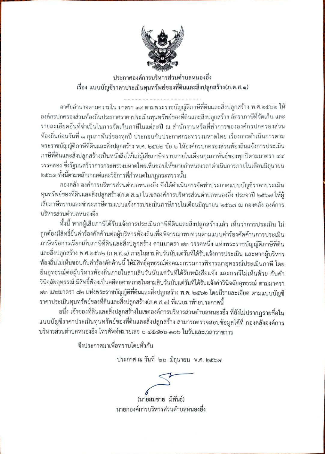 ประกาศองค์การบริหารส่วนตำบลหนองอึ่ง เรื่อง แบบบัญชีราคาประเมินทุนทรัพย์ของที่ดินและสิ่งปลูกสร้าง(ภ.ด.ส.1) ประจำปี 2567