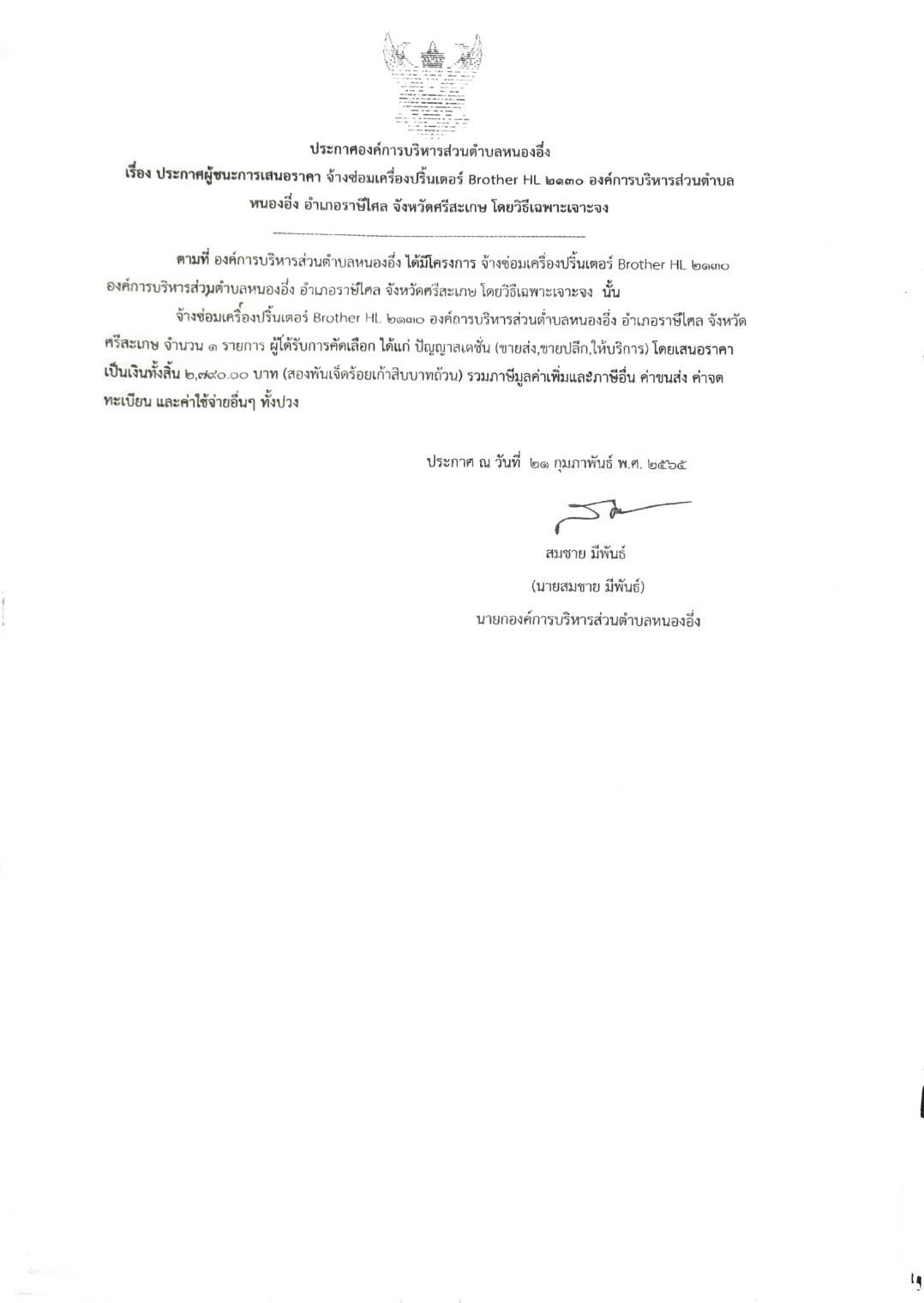 ประกาศองค์การบริหารส่วนตำบลหนองอึ่ง เรื่อง ประกาศผู้ชนะการเสนอ จ้างซ่อมเครื่องปริ้นเตอร์ Brother HL-2130